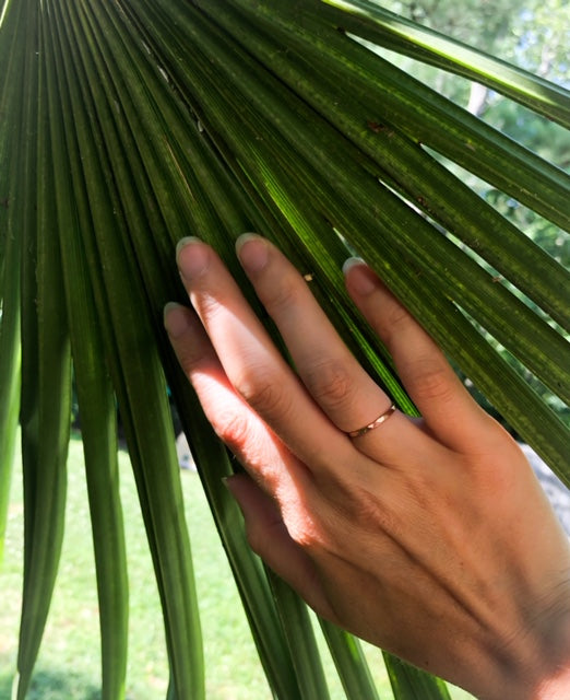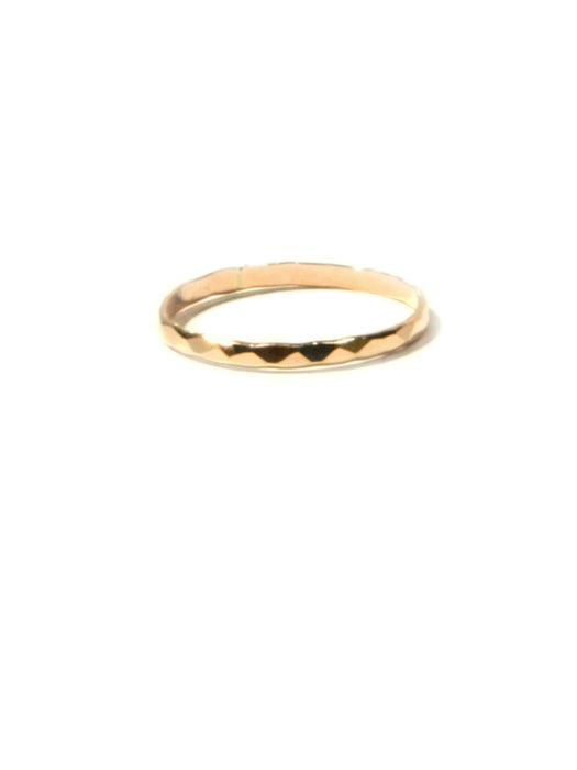 Delicate rose gold filled band with hammered detail for some texture. Band is 1/16" wide, which makes it ideal for stacking!