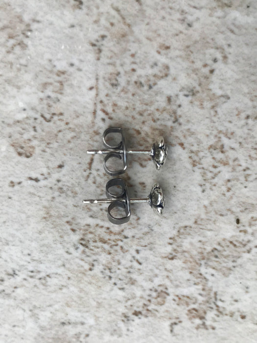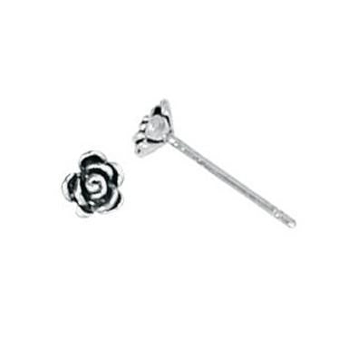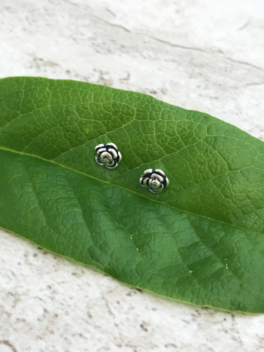 These stud earrings are tiny rose blossoms with oxidized details.