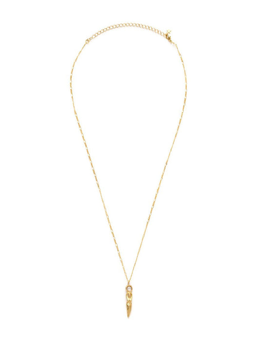 Selene was the Greek goddess of the moon. This figural pendant is crafted from soft matte gold and is holding a moon of mother of pearl.