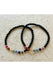 Stones include: amethyst, lapis, blue agate, aventurine, yellow agate, carnelian, and red coral. There is a gold or silver spacer bead in between each stone.The rest of the stones are 4 mm black agate beads. Elasticized to fit most wrists.