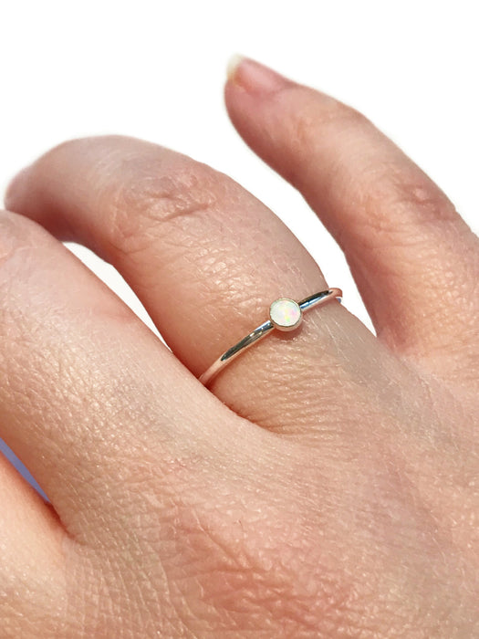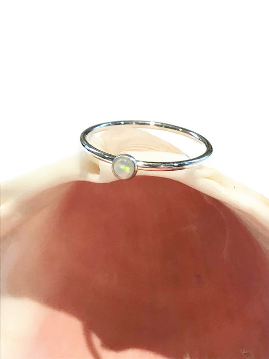 This dainty ring is a dome of white opal bezel-set into a handcrafted sterling silver. Perfect for stacking!