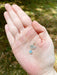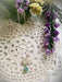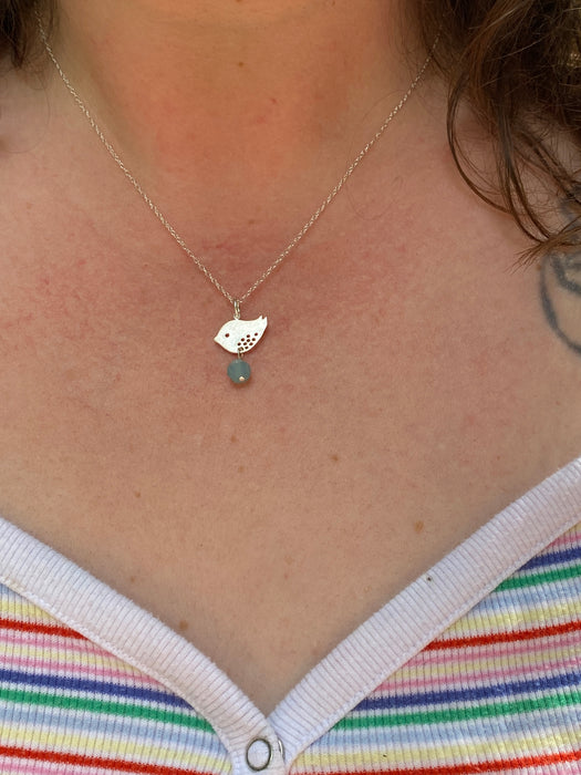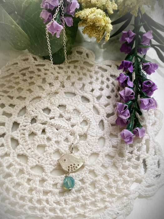 This necklace features an adorable little spotted bird pendant with an ocean blue Swarovski crystal dangle.