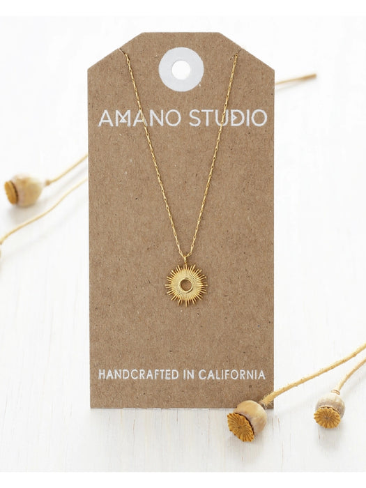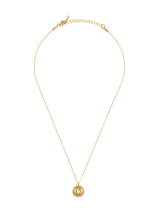 The sun, giver of life, is a powerful symbol and talisman. This necklace is our homage to el sol, with a radiant bursting golden sun pendant. Made of brass with a 14k gold plate.