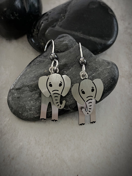 These adorable dangle earrings feature a two-part elephant that sways and moves, crafted from brushed steel with black enamel details on face, trunk and feet.