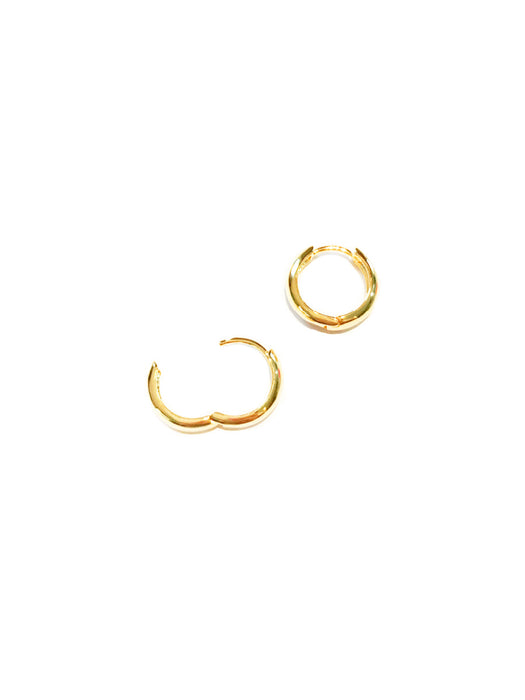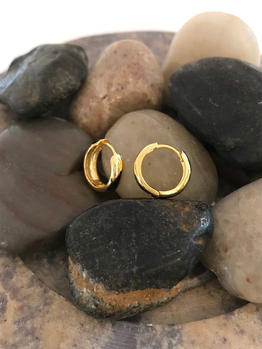 These are our popular huggie hoops in a slightly thicker style. Huggie hoops are hinged at the bottom and snap securely closed.