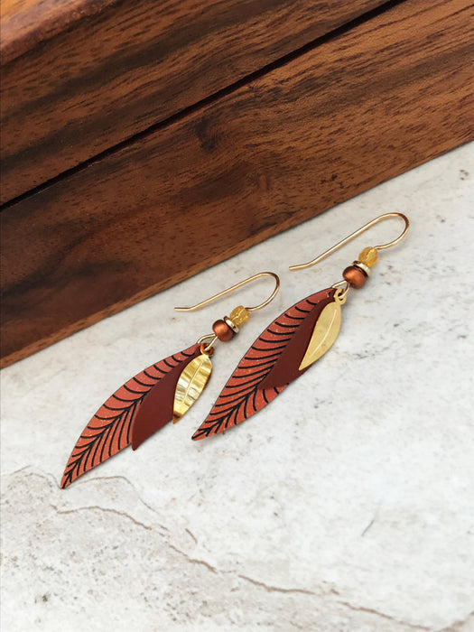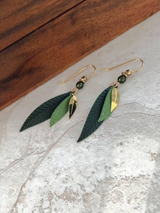 Three slender leaves made from lightweight metal & vibrant enamel are layered for graceful movement.