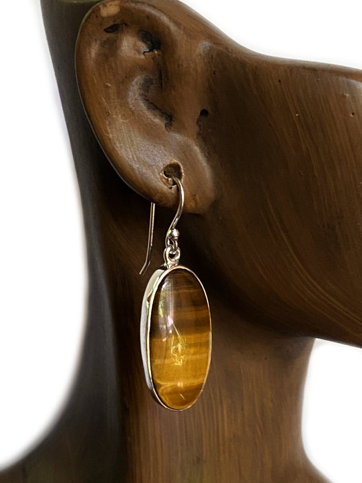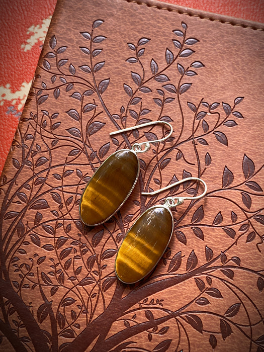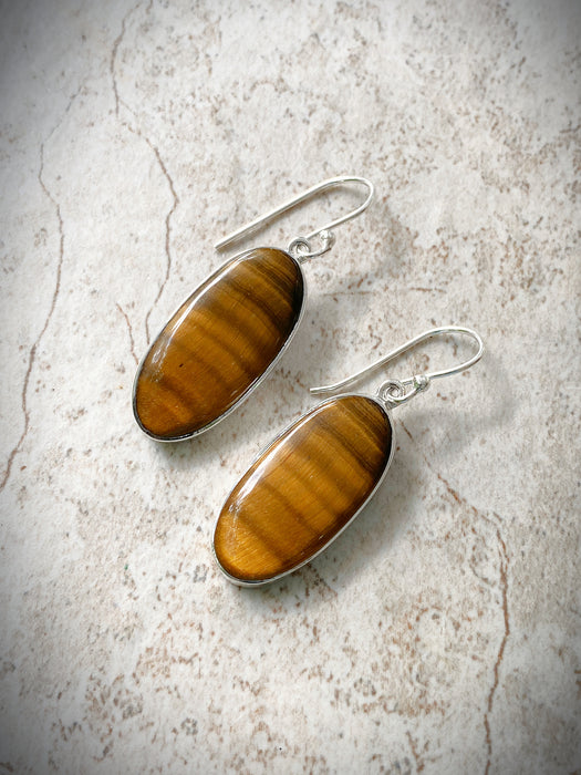 Tiger's Eye is a classic gemstone that has been used for centuries as a protective talisman, with bewitching chatoyancy that shifts in the light. These polished oval slabs of tiger's eye have been encased in sterling silver and are a fabulous statement earring in a neutral shades of brown.
