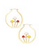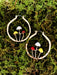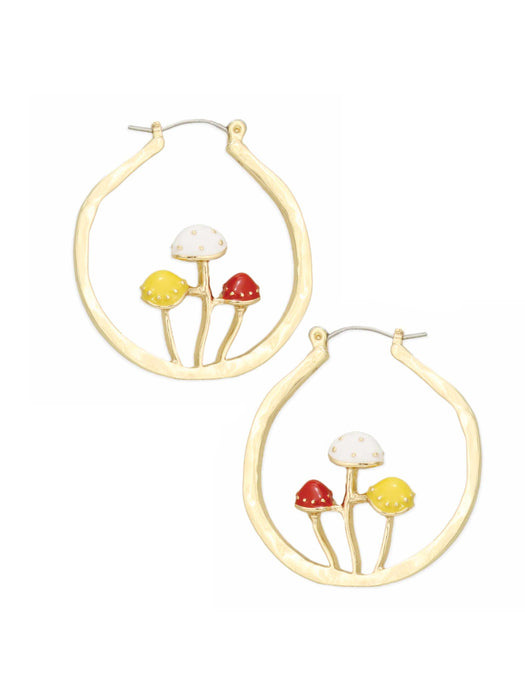 These whimsical earrings are large gold hammered hoops with three mushrooms sprouting from the inside of the hoop. Each mushroom is capped off in enamel in red, white & yellow.