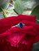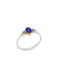 This ring features a polished oval of navy-blue lapis set with a bright blue turquoise gem on each side. The stones are set in brass with a silver band for an organic multi metal look. Toothed edge detail and ball beads add extra decoration.