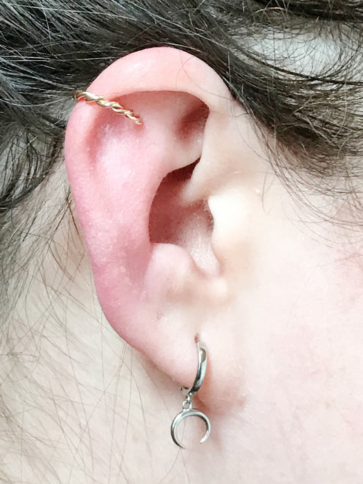 This ear cuff is two wires twisted together to make a beautiful band. Wear easily by gently opening and closing to fit around desired spot on ear.