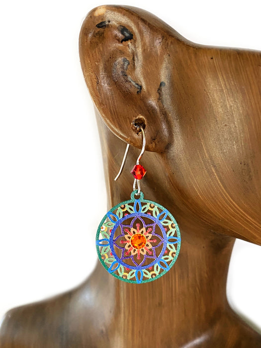 These dangle earrings feature a lightweight cutout steel mandala enameled in vibrant shades of blue, green, orange and purple. A sparkling orange rhinestone rests in the center.