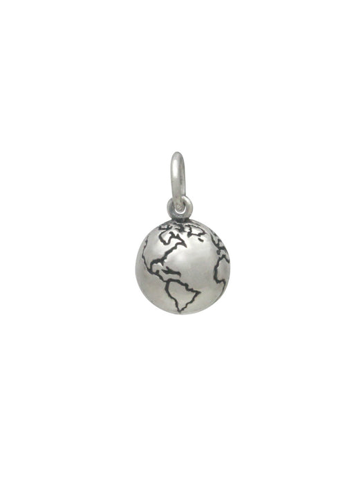 This necklace features a pendant of a three-dimensional globe with oxidized details.