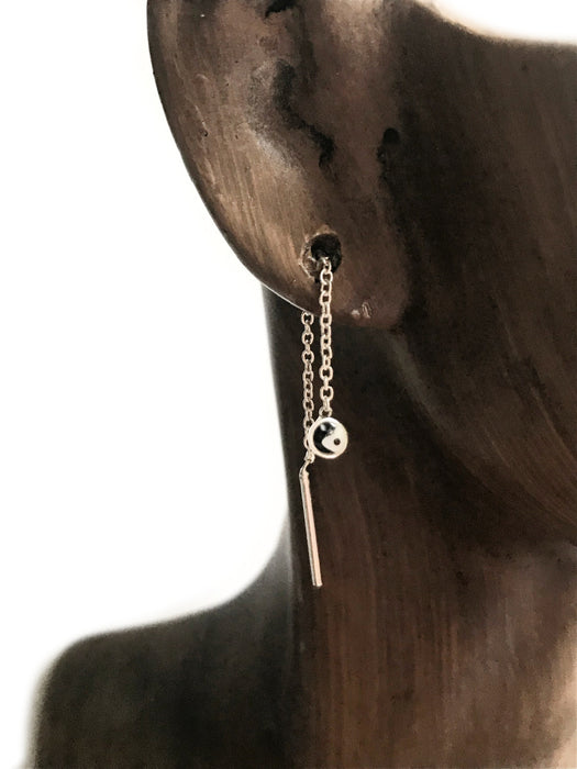 These modern & minimalist ear threads are sterling silver chain with a yin yang charm at the bottom. The yin yang is an ancient symbol representing duality & harmony. Ear threads are worn by simply pulling through ear to desired point for a sleek modern style.
